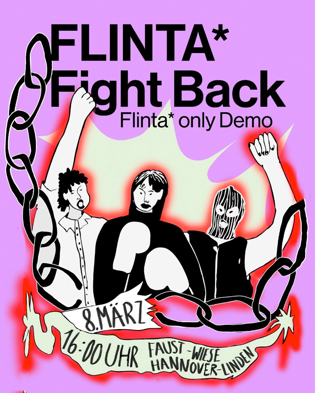 Straße zu bringen. Dafür haben wir uns als FLINTA* zusammengefunden, um eine FLINTA*only-Demo am 8. März zu organisieren. Damit nehmen wir uns zurück, was uns sowieso gehört: den öffentlichen Raum. Wir tragen feministische und queere Kämpfe auf die Straße – laut, stark, sichtbar.